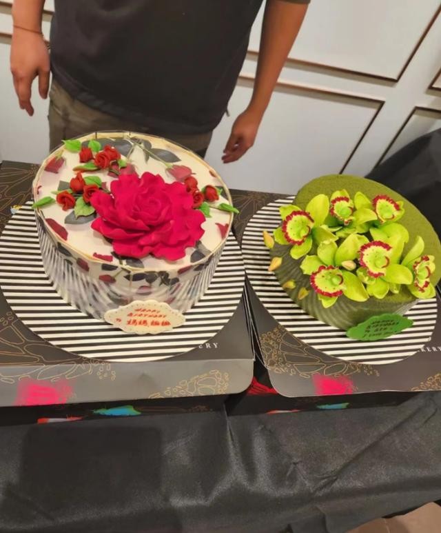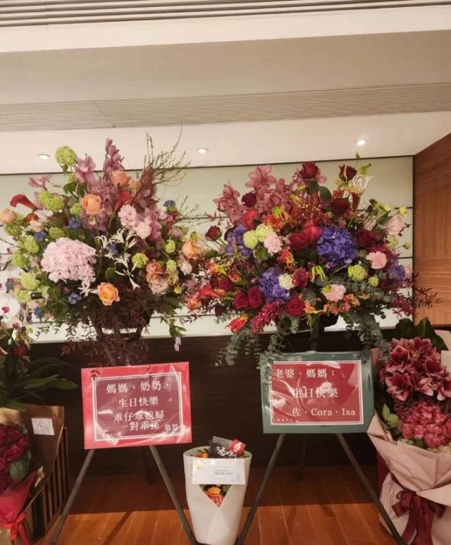 不仅有蛋糕还有好多鲜花,向佐携郭碧婷和一双儿女送给向太,然后向佐又带着儿子和女儿送给碧婷,并写道:" 老婆,妈妈,生日快乐,佐、Cora、Isa"。