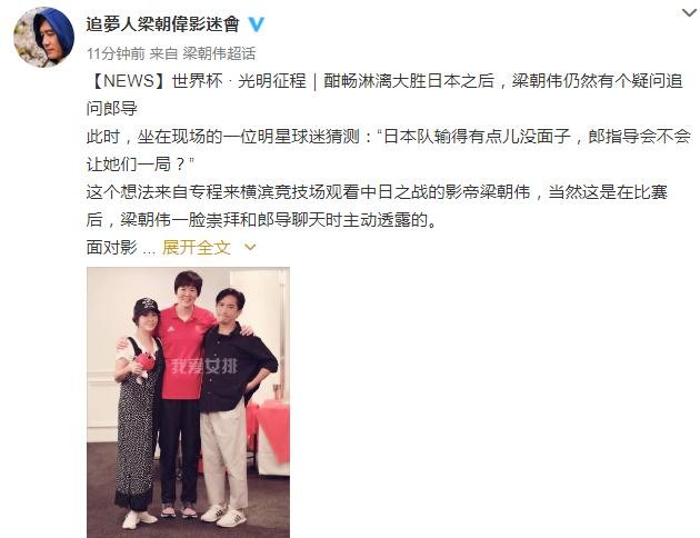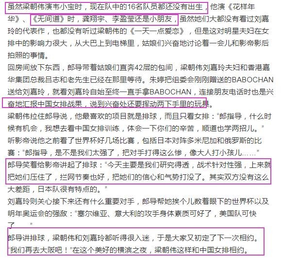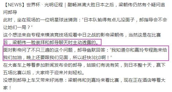 梁朝伟影迷会分享说梁朝伟一直是一脸崇拜的跟郎平聊天,并且问郎指导会不会让她们一局,最后郎平幽默的回答说:“我知道你和嘉玲专程跑来给我们加油,晚上还要跟我们见面,所以赶快3比0啊!”