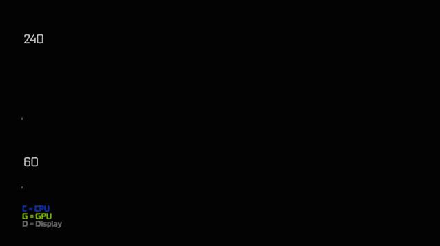 通过动图可以看到显示器的刷新速度是恒定的,而GPU的渲染速度会根据所渲染的画面中的复杂程度而引起差异,如果画面中有着大量的爆炸,粒子效果,环境及人物建模众多等情况,那么其渲染所需要的时间就会比较长。