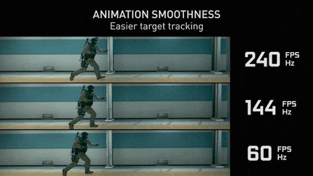 当刷新率为60Hz时表明,每秒显示器刷新60个静态帧,同理240Hz时每秒刷新240个静态帧,因此在240Hz时每帧只需要4ms的刷新时间,想比60Hz要减少大约13ms,从而画面也就越流畅,并且可以帮助玩家更轻松的追踪目标。