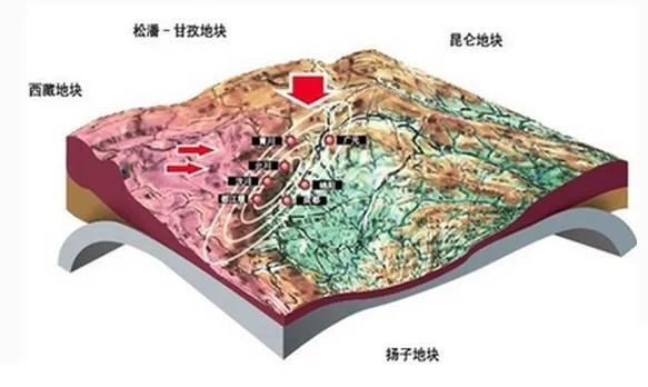 地壳的挤压和碰撞使得地壳不稳定,形成了断裂带,这就是为何青藏地区多地震的原因。板块内部并不是完整的一块,而是由小板块组成的,中国南方大部分均位于扬子准地台上,四川盆地也位于其上,四川盆地的地质较为坚硬,青藏高原的地质较为软一些,所以在地壳的挤压作用下,较软的物质覆盖在较硬的物质至上,并且随着地壳运动方向运动。