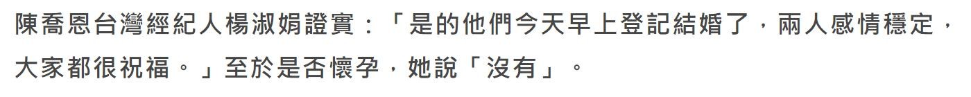 陈乔恩结婚的消息传出后,她的经纪人杨淑娟也出面证实:“是的,他们今天早上登记结婚了,两人感情稳定,大家都很祝福。”至于是否怀孕,她则澄清并“没有”。