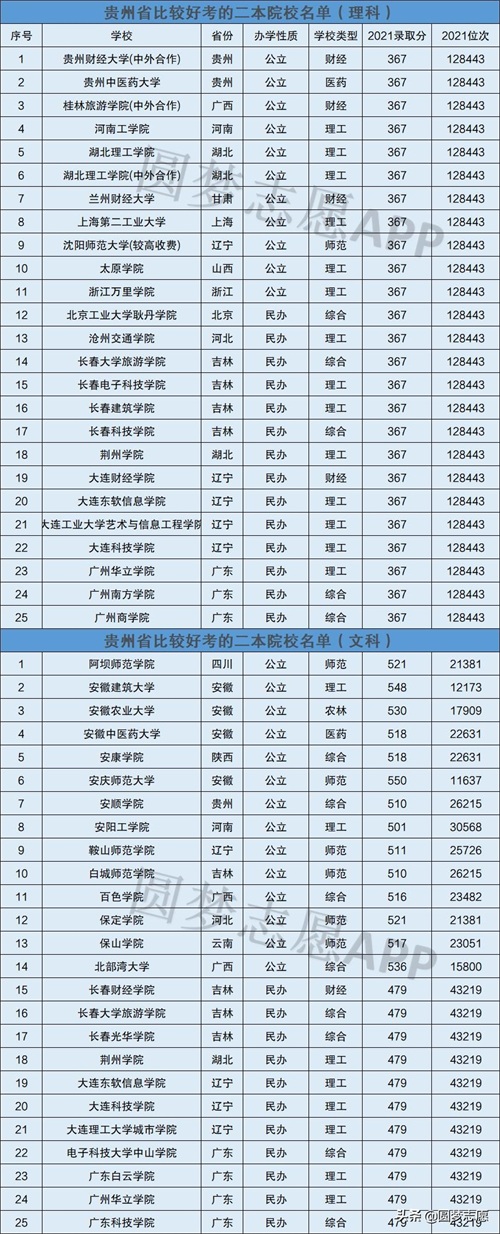 为了方便低分考生也能够报考正规的院校,小编根据2021年在贵州省内录取分数线较低的二本大学,列出了“贵州省适合捡漏、比较好考的二本院校名单”,仅供考生参考: