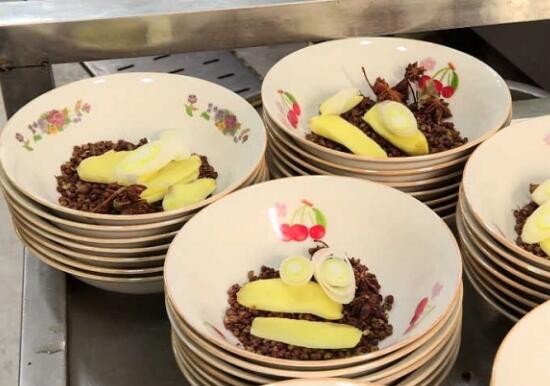 厨师邵建华说:“下面垫了花椒,一般都要是红花椒,红色的花椒有香味有麻味,然后放生姜两片,去肉的腥味还增香。放花椒、八角,再放点大葱片。”