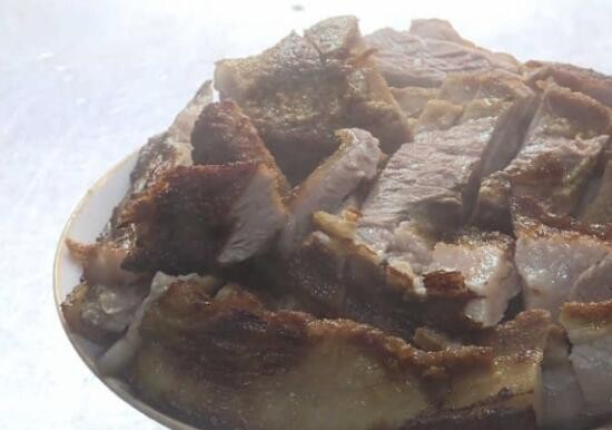 此时,经过油炸的五花肉已经肉皮焦黄起泡,接下来就可以切块蒸制了。