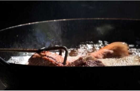 厨师邵建华说:“拿筷子轻轻地能戳进去,就属于熟了,捞出来之后抹上蜂蜜抹上白酒,它(做出来)有颜色,会发红发亮,起(虎)皮很多,你要不擦任何东西的话,皮根本就起不来了。”