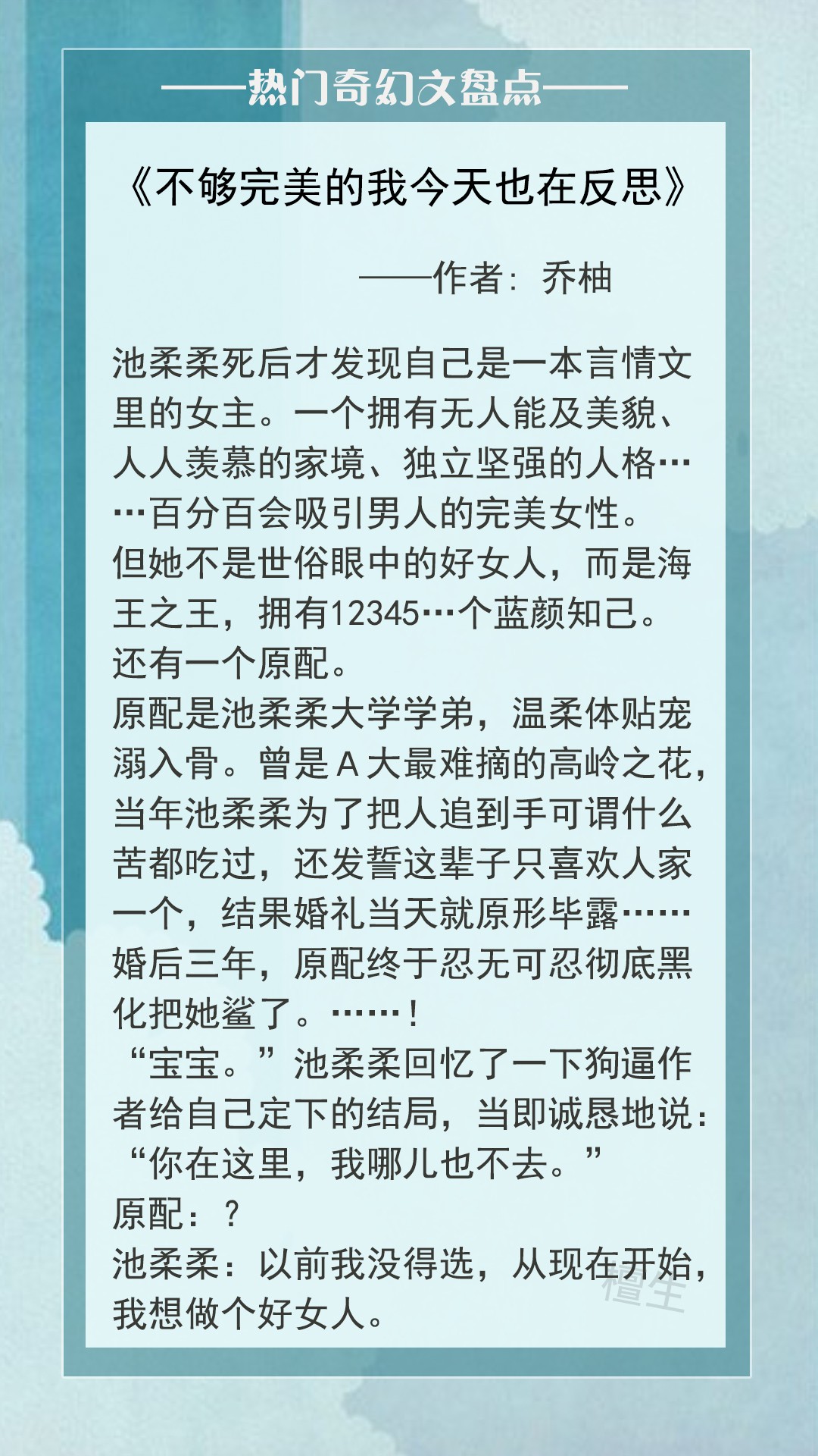 简评:女主被有心人用小说的模式构造了人生,成为了“博爱多情、追求刺激”的海王。男主本是高岭之花,被她攀折后沦为了可怜的玩物。面对这样美貌痴情的男主,女主仍然不满足,追逐脚踏六只船的背德快感。男主爱得卑微,最后彻底黑化,选择了玉石俱焚。这便有了第二世,男主先觉醒,一直处在患得患失的忧虑中,他想“离婚”,又放不下女主施舍的那点温柔,矛盾十足。女主预知了剧情,为了避免这个结局,她努力抵抗住各种诱惑,外面的野花再诱人,也比不上自家小命重要!至于男主嘛,耐心哄哄,依然是贤良淑德的好丈夫!