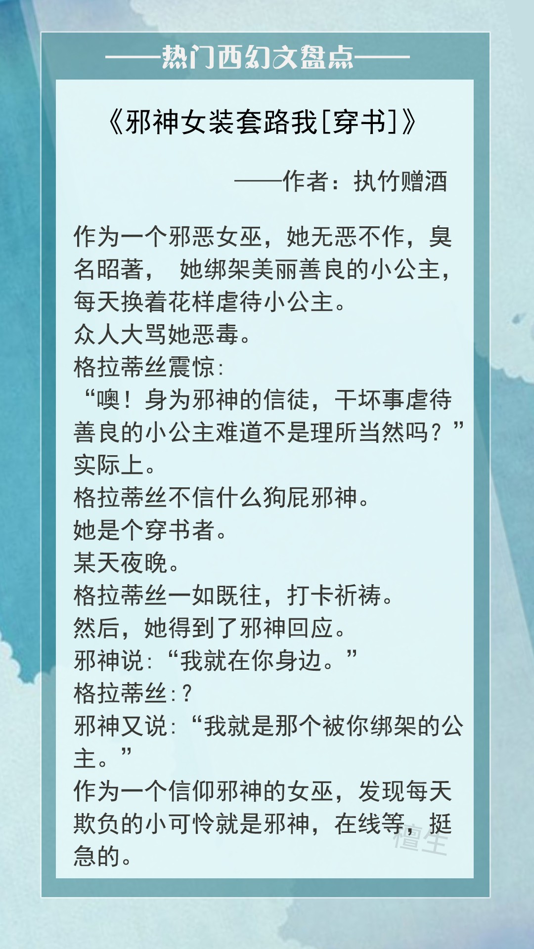 简评:喜欢看小说的女孩运气都不会差,看完吐槽的姑娘遭遇穿书警告。参加大学恋爱社团的女大学生柳诺在看过完一本西幻玛丽苏文后,感觉智商被摁在地上摩擦,忍不住批判了几句,就被老天投放到这本小说里。在书中,她是恶毒的反派,是邪恶的女巫格拉蒂丝,要按照系统的指示,专干丧尽天良的事。比如:把美丽的公主从城堡中绑架出来,对她进行各种凌辱。女主骑着扫把,拎着魔杖,兢兢业业的做任务。只是,没想到,那个被她花式欺负的小可怜是深渊邪神,黑发金眸如天使般漂亮的脸蛋,却满肚子坏水。