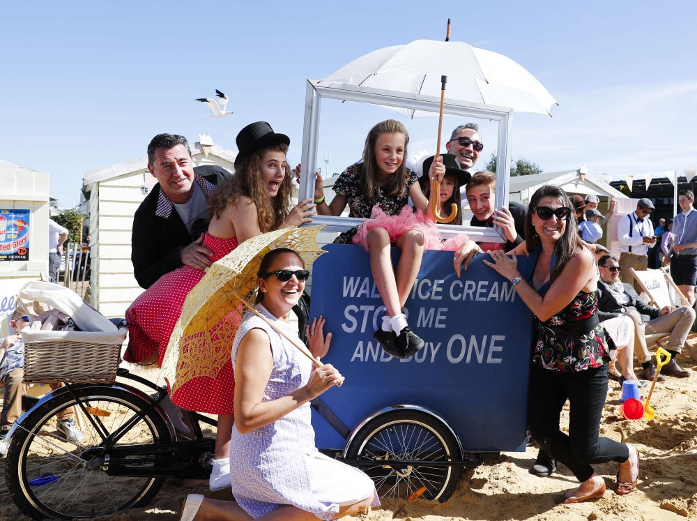 ↑这是2016年9月11日,在英国古德伍德复古节上,身穿复古服装的人们在一辆冰淇淋车旁自拍。新华社记者韩岩摄