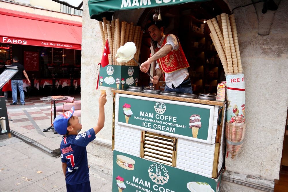 ↑7月10日,在土耳其伊斯坦布尔的一家冰淇淋店,店员与小顾客互动。新华社记者徐速绘摄