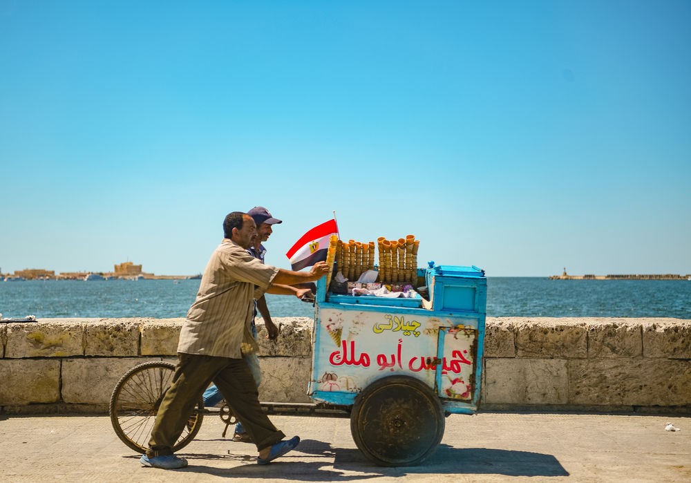 ↑7月4日,在埃及亚历山大,小贩在地中海旁售卖冰淇淋。新华社记者李琰摄