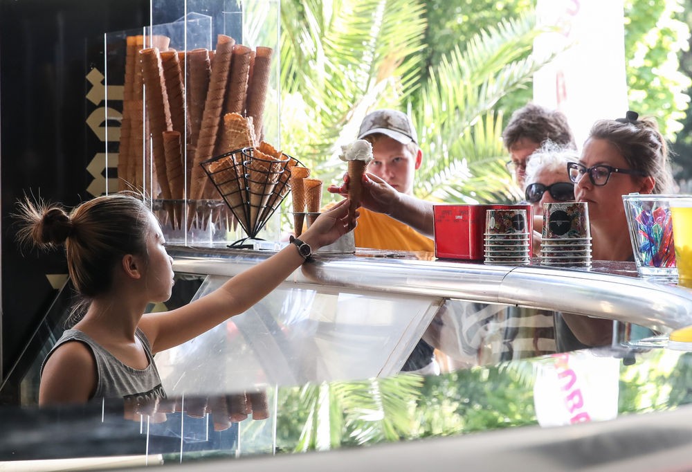 ↑7月25日,在德国首都柏林,人们在一家冷饮店购买冰淇淋。新华社记者单宇琦摄