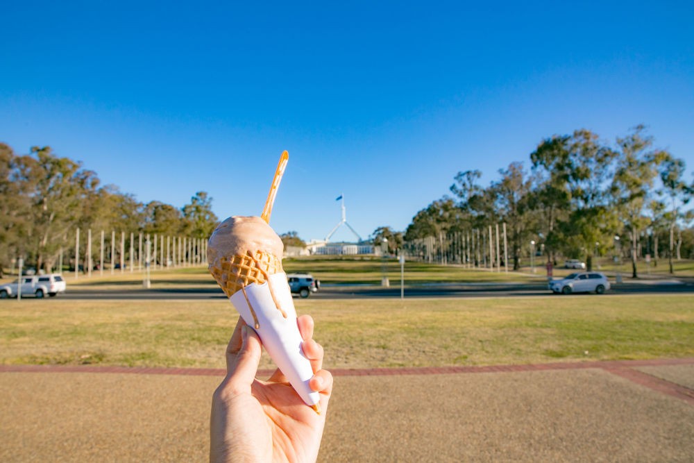 ↑7月25日,在澳大利亚首都堪培拉,一名游客在国会大厦前手举冰淇淋。新华社发(张心馨摄)