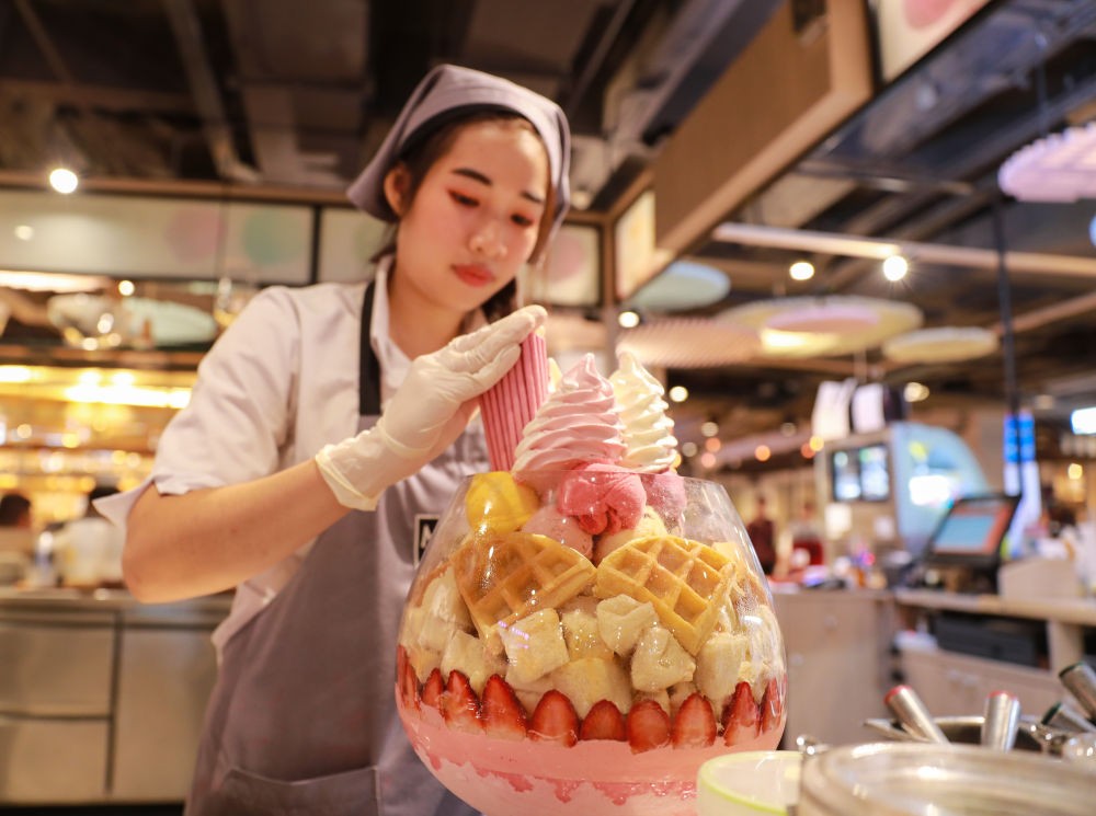 ↑7月28日,在泰国曼谷,顾客在一家冰淇淋店分享冰淇淋。这家冰淇淋店因为其超大款的冰淇淋走红网络,吸引许多游客前去拍照打卡。新华社记者张可任摄