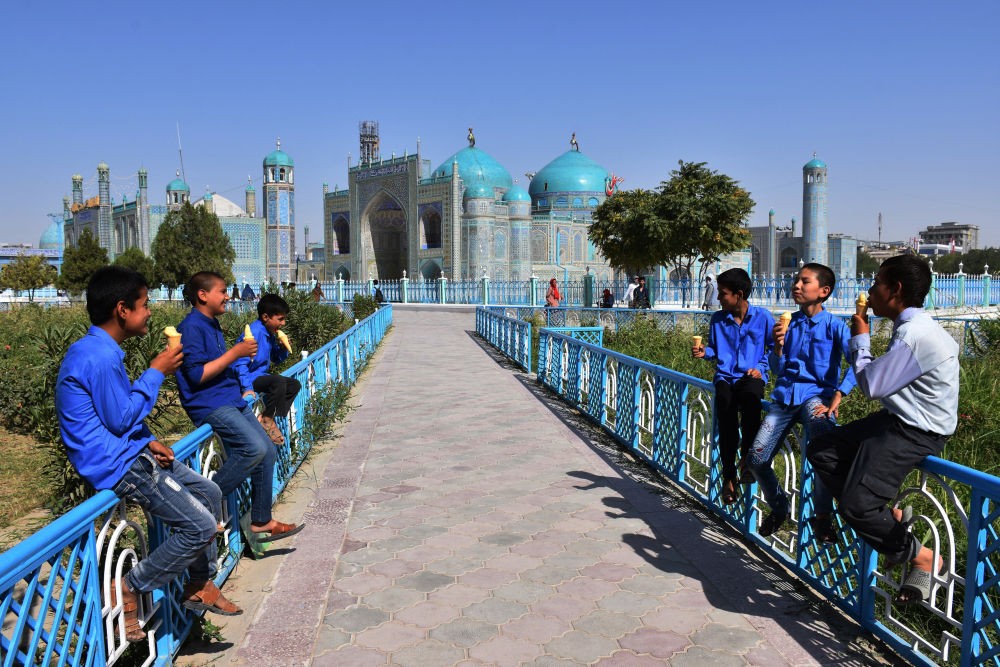 ↑7月21日,在阿富汗北部巴尔赫省首府马扎里沙里夫市,男孩们在著名的蓝色清真寺前吃冰淇淋。新华社发(卡瓦·巴沙拉特摄)
