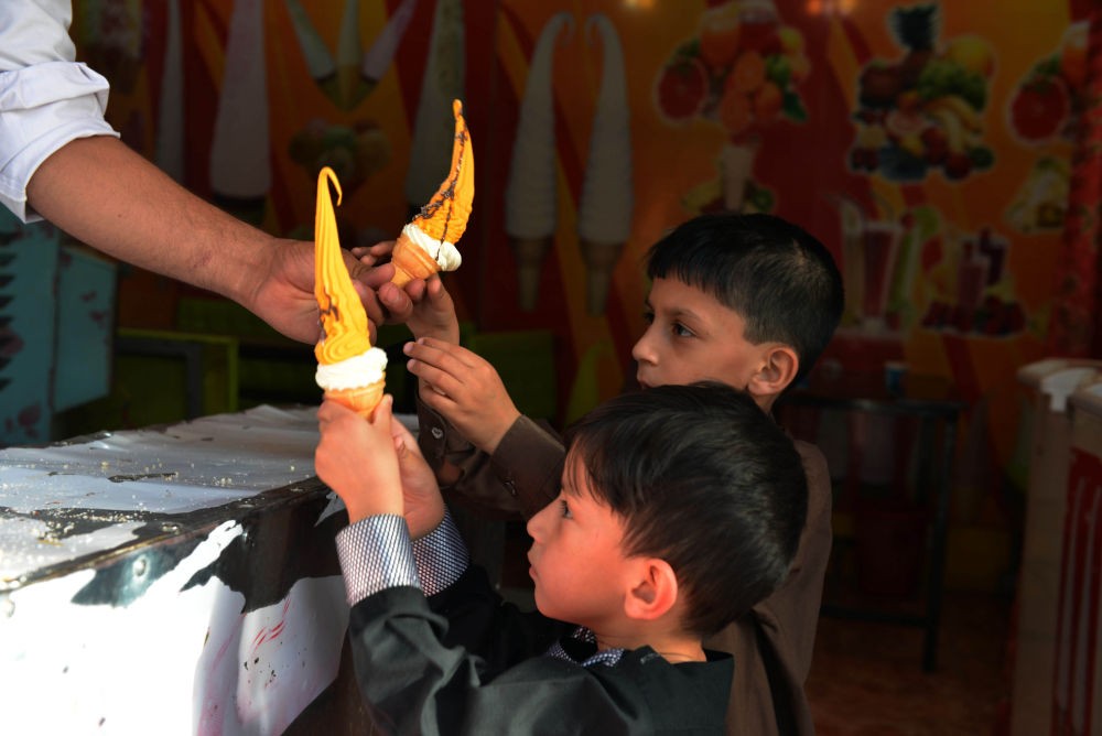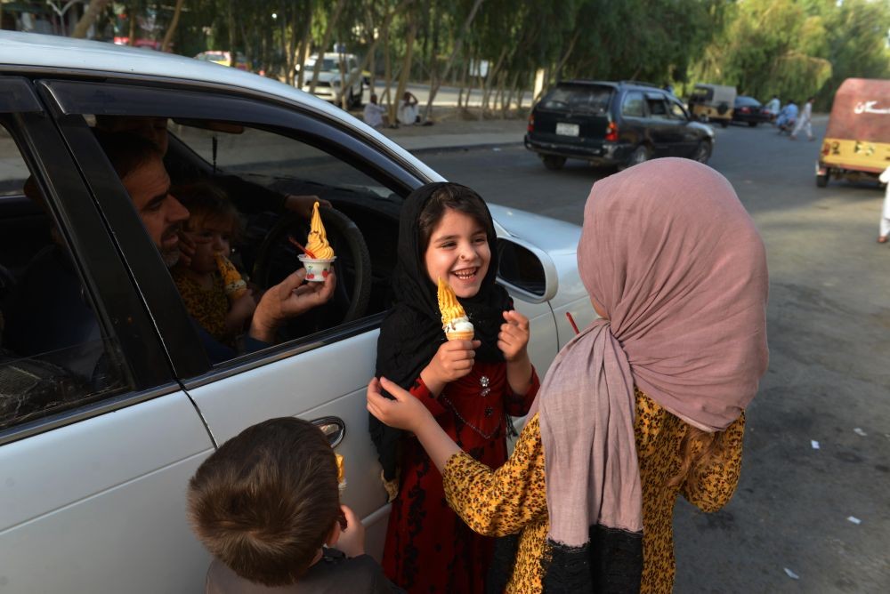↑7月24日,在阿富汗南部坎大哈省首府坎大哈市,当地儿童与家人在街头吃冰淇淋。新华社发(萨纳乌拉·西奥姆摄)