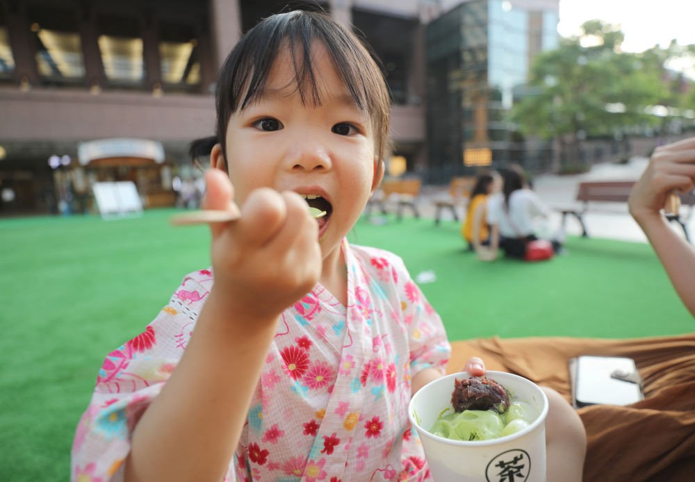 ↑7月30日,一个小女孩在日本东京吃抹茶冰淇淋。抹茶是日本的特色口味,这款冰淇淋中还加入了红豆沙、栗子、糯米团等日本传统点心常见的配料。新华社记者杜潇逸摄