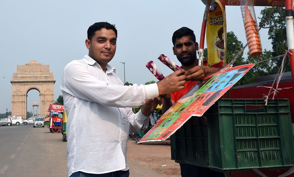 ↑7月23日,在印度首都新德里“印度门”附近,一名男子在冰淇淋摊位前购买冰棍。新华社记者张迺杰摄