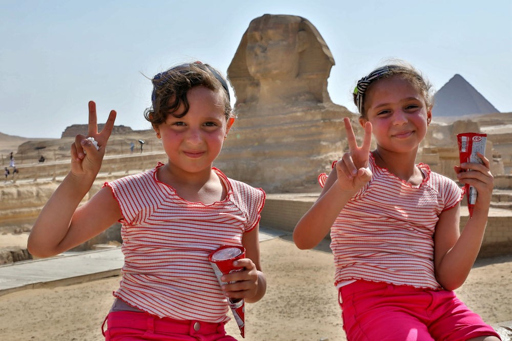↑7月19日,在埃及开罗吉萨金字塔景区内,两名儿童展示手中的冰淇淋。新华社记者王腾摄