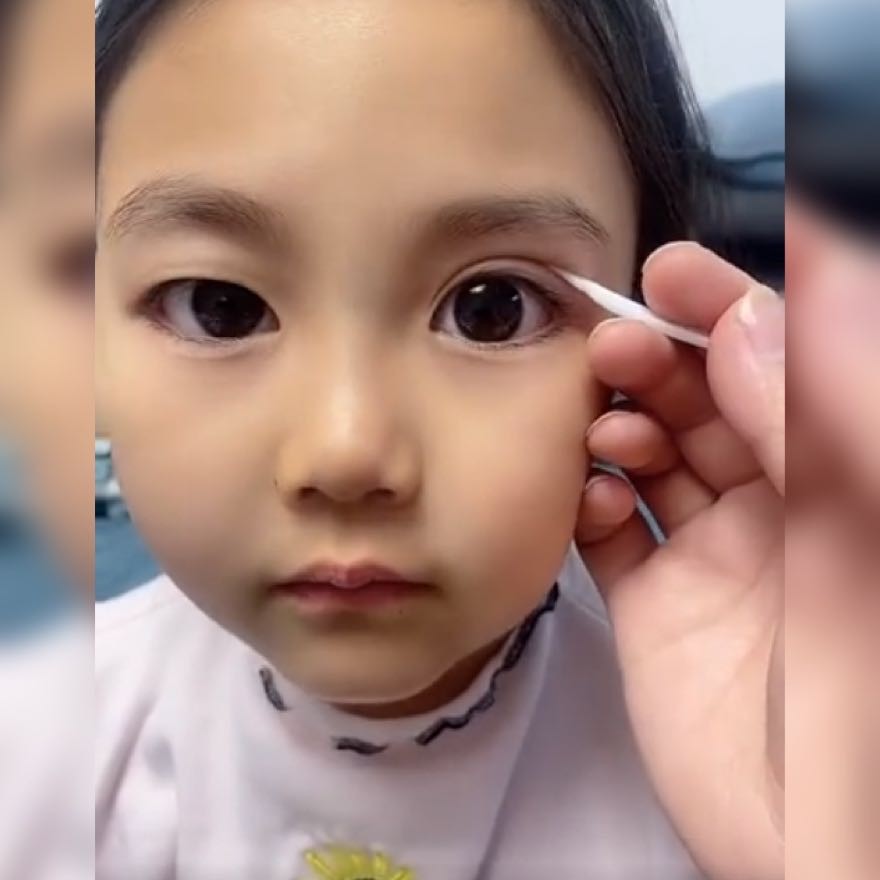 视频一开始,小姑娘坐在镜头前,眨着自己的眼睛。可以看到小姑娘就是单眼皮。不过也非常可爱了。然后妈妈开始动手演示了。她先是在孩子眼皮上轻轻描了描,找了找画双眼皮的位置。然后用化妆的小刷子在眼皮上轻轻涂抹了一层白色软膏,先给眼皮做做润滑,防止画双眼皮的受伤。然后,妈妈正式上手了。妈妈先让孩子闭上眼睛,然后拿着一个一头细细的白色工具贴在小姑娘眼睛中后部分的眼皮上。小姑娘一睁开眼睛,哦豁!双眼皮就出现了,眼睛也变大了好多。看起来又大,又黑,又亮,简直撩人心弦。小姑娘的要知足的上升了不少呢!