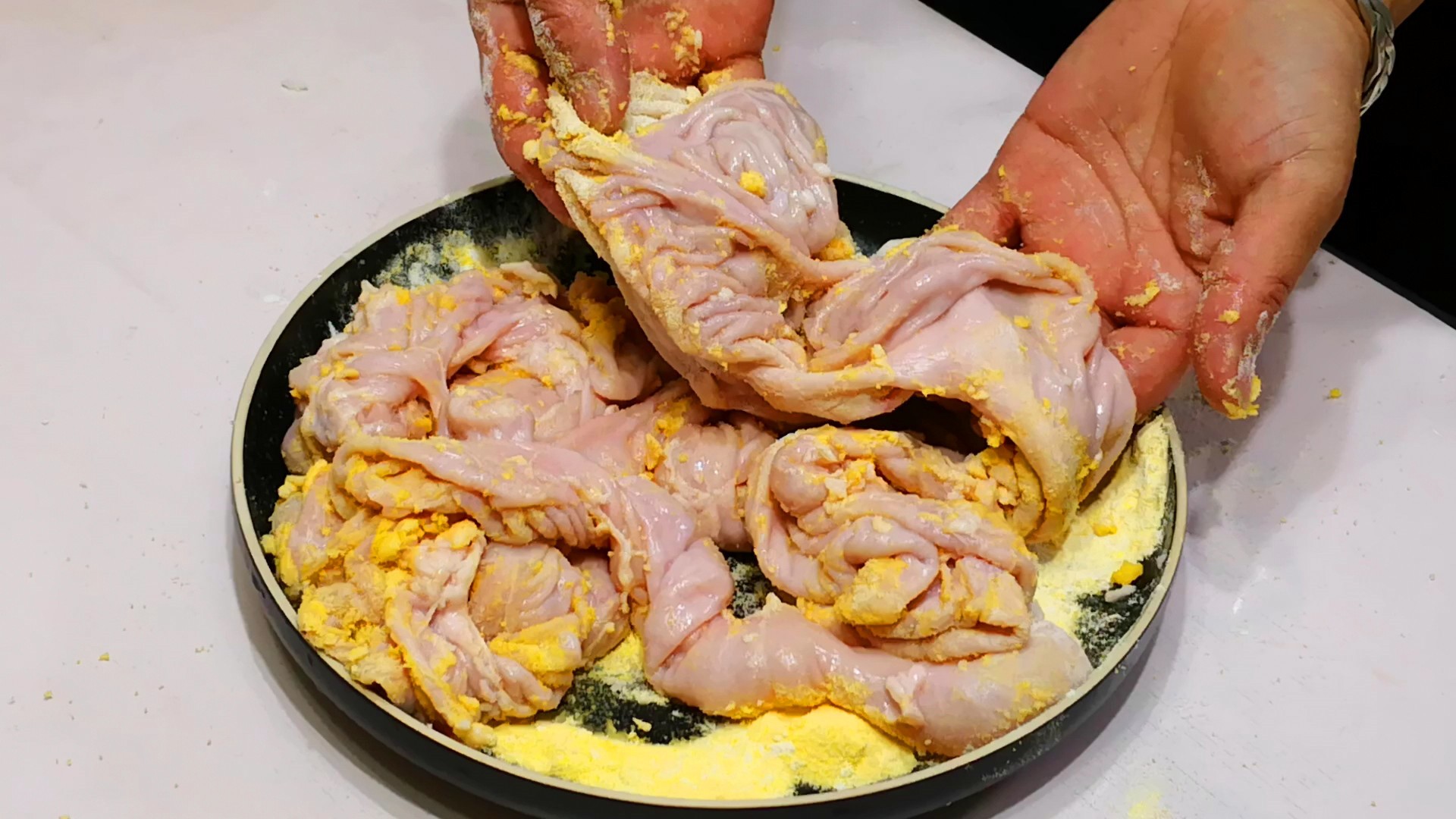 加入盐和面粉多搓洗一会儿后,你就可以发现肥肠上的油脂已经被粘附下来了,但因为面粉变湿了就会感觉粘乎乎的很是粘手,不要着急,这时,我们再加入一些玉米面,然后继续搓洗,玉米面的颗粒感强,可以增加摩擦力,而且还不粘手,加上玉米面从头到尾搓洗一遍后,我们就会发现,大肠上的油脂和粘附的面粉已经被搓掉了,手也不粘了,这时再用清水多冲洗几遍,将肥肠光滑的一面彻底清洗干净。