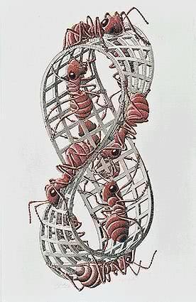 他最著名的一幅作品就是以莫比乌斯环为灵感而创作的《莫比乌斯二代》,几只蚂蚁正在莫比乌斯环上爬行。