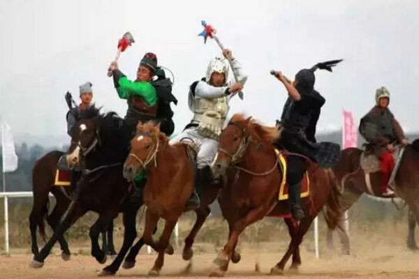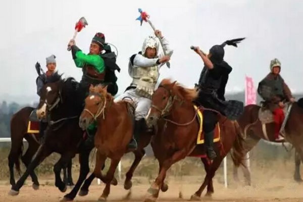 “董卓老贼出来!” 藏马山御马场马战表演场内,身穿红衣披盔甲的刘备手持双股剑叫阵董卓,身旁立着关羽、张飞。这里每天上演三国经典历史故事《三英战吕布》大型古装马战实景表演。