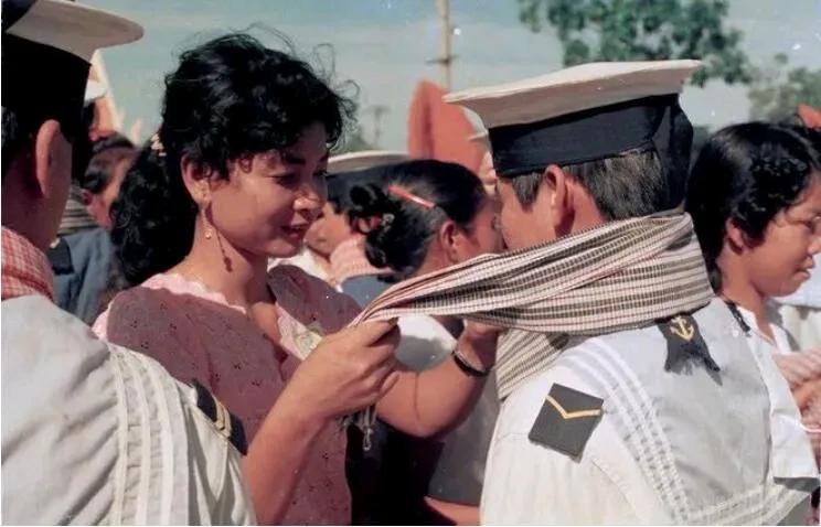 柬埔寨妇女在撤军仪式上为越南士兵戴上象征吉祥的围巾