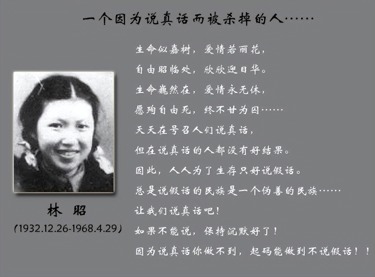 林昭(1932年——1968年)苏州人,著名民主人士,60年代曾在提篮桥监狱关押。