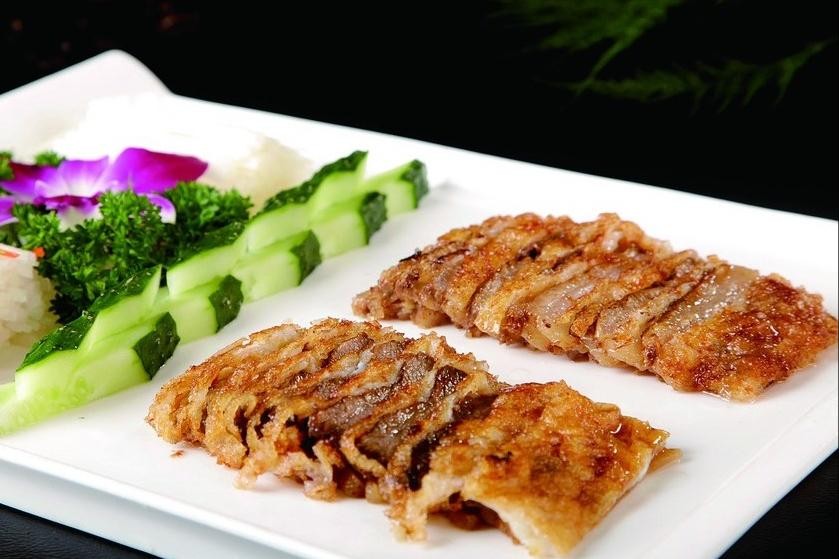 炸紫酥肉是一道以猪肋排为主料的菜肴,需要经过煮、腌、蒸和反复炸制等工序,成菜看上去色泽棕黄发紫,所以菜名里就带了个“紫”字。在吃这道菜时,通常要配上葱段和甜面酱,猪肉尝起来肥而不腻,外焦里嫩,可以跟烤鸭媲美,还被称作“赛烤鸭”。