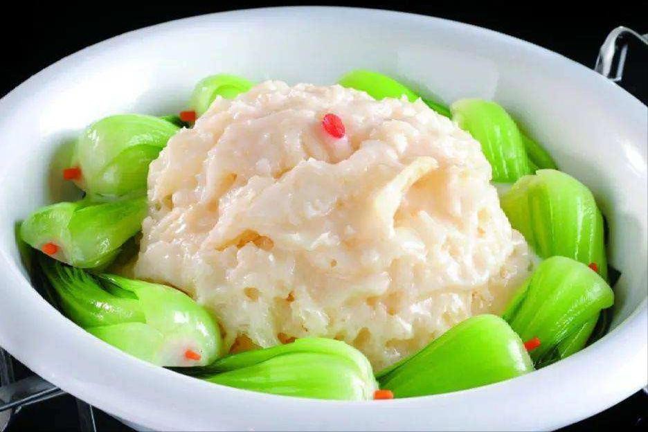 广肚,又叫鳘鱼公肚,是用公鳘鱼的鳔加工制成,本身就属于一样比较名贵的食材,在唐宋时期也是进贡给朝廷的贡品。早在北魏时期的著作《齐民要术》中,就有提到过广肚。扒广肚这道菜,也是河南名宴广肚席的头菜。