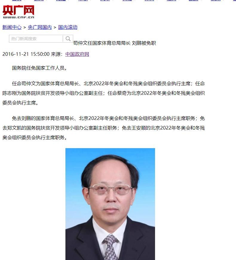 苟仲文任国家体育总局局长 刘鹏被免职——央广网