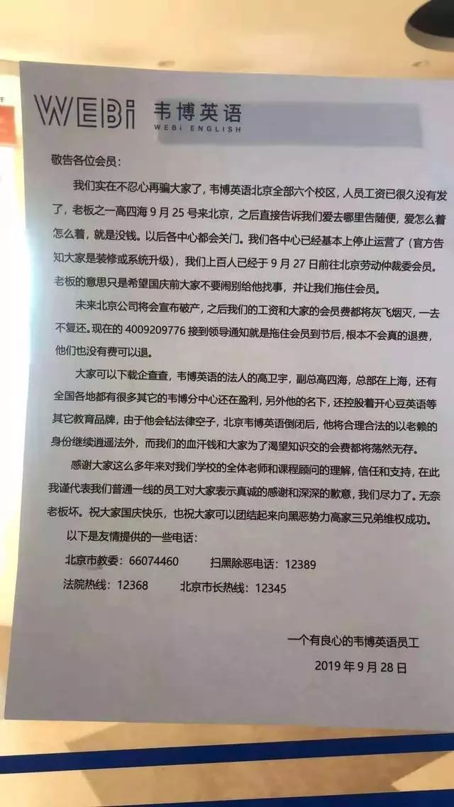 近日,网传一张自称是“有良心的韦博英语员工”贴出的公告(下称《公告》),引发韦博英语学员广泛关注。《公告》称韦博英语北京公司将宣布破产,北京各中心已以装修或系统升级的名义停止运营,学员会员费与员工工资均无处追讨。