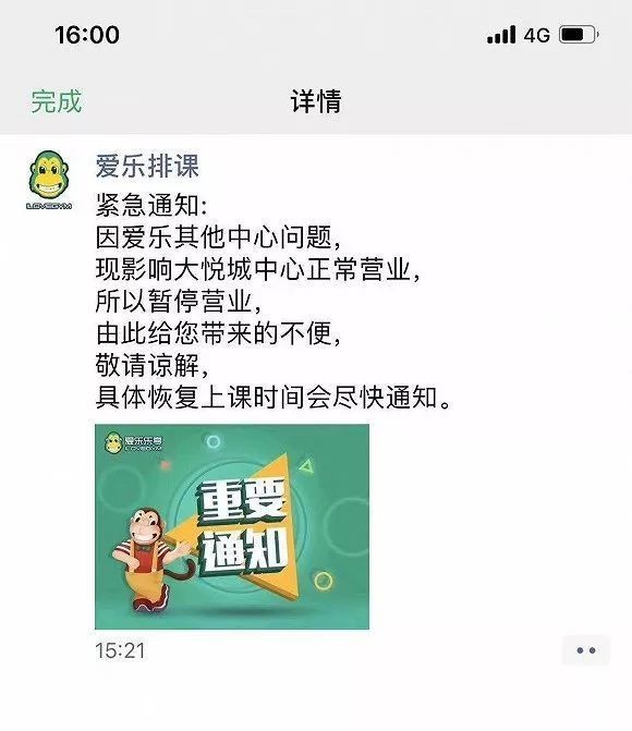10月16日爱乐排课发出暂停营业通知,有家长反馈,爱乐乐享在北京关闭之前,还搞十周年店庆活动,用大优惠吸引用户消费。此次突如其来的闭店让孩子无法继续学习购买课程内容,家长也找不到渠道申退之前已经缴纳的培训费。数以万计的血汗钱无处申讨......