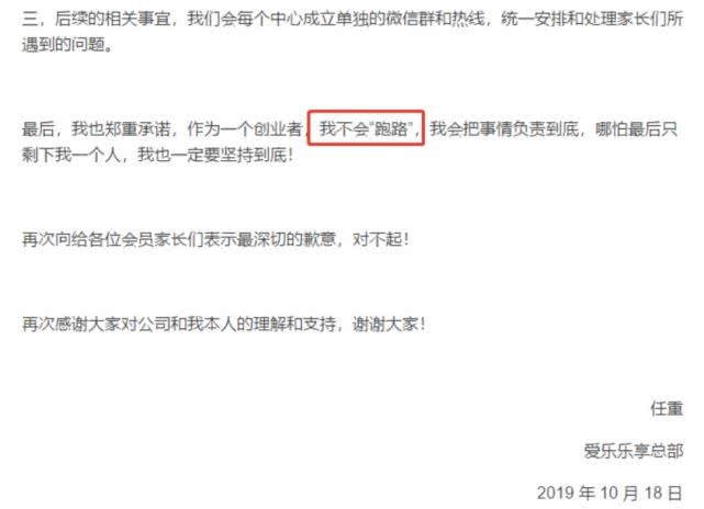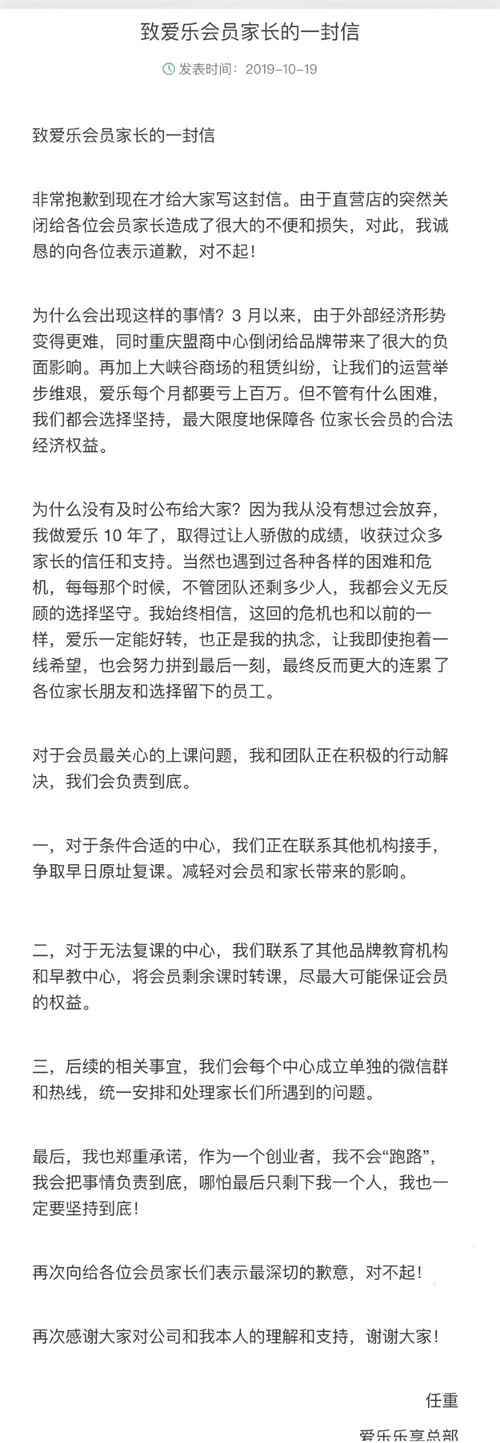10月18日,爱乐乐享创始人任重在官网发布致歉信,称由于直营店的突然关闭给各位会员家长造成很大的不便和损失,对此,诚恳道歉。