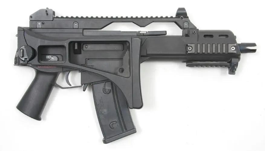 此外,为了减轻重量,G36C 取消了 G36 带光学瞄具的提把,改为提把状的 瞄准镜座导轨,可以迅速安装光学、夜视 瞄准镜、光点指示器或强光手电等附件。 如果希望进一步减轻重量,还可以卸掉 通用瞄准导轨,安装可折叠的觇孔瞄准 具。在25米内,射手也可借助瞄准导轨 本身进行概略瞄准射击,十分适合近战 巷战。