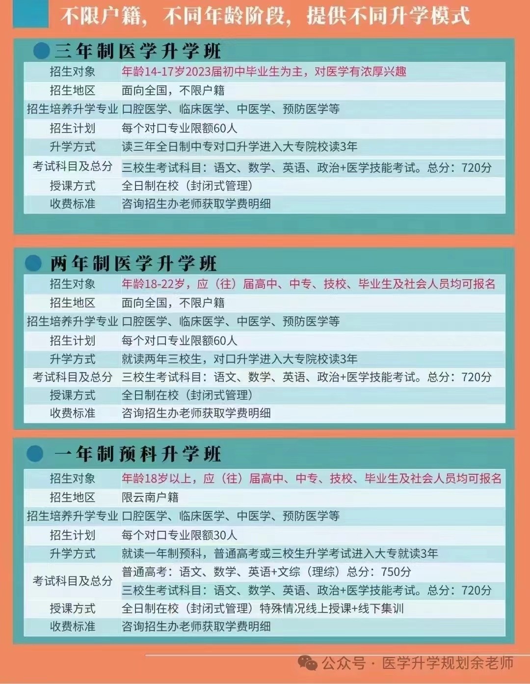 温馨提醒:目前口腔医学、临床医学,中医学、护理学名额充足,文化科目成绩不太理想但又想学医的,社会人士需要转医学专业的,从医人员没有证的,都可以咨询余老师,单招、对口升学、技能高考、夏季高考不同的升学方式为你量身定制,让你考上理想的大学,更多问题请咨询余老师,可扫码添加上面余老师的微信进行私信沟通。专注医学升学,圆梦执业医师!关注我,升学不迷茫。