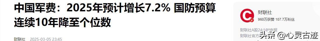 【1】财联社-《中国军费:2025年预计增长7.2% 国防预算连续10年降至个位数》(2025-03-05)