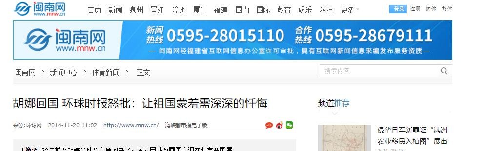 信源|闽南网—胡娜回国 环球时报怒批:让祖国蒙羞需深深的忏悔