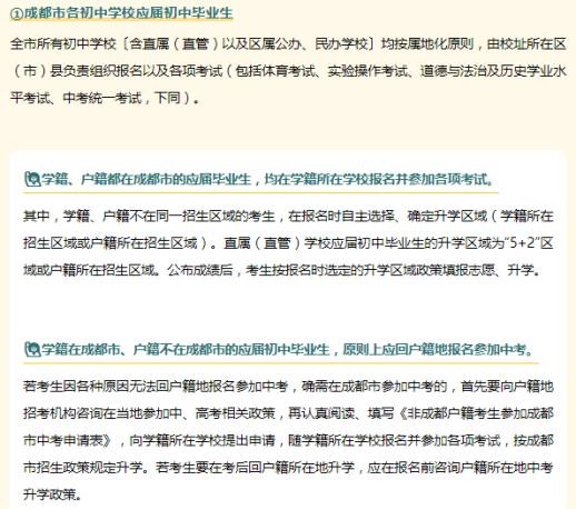 学籍在成都的考生,无论其户籍在哪里,都在目前学籍所在学校的区(市)县的招考单位组织下完成报名手续,其中包括户籍不在成都市,但又申请参加成都中考的初中应届毕业生。
