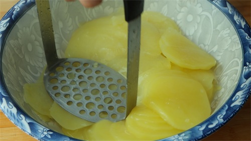 切好后装盘。这个时候我们的土豆也蒸好了,取出来,趁热用磨具,压成土豆泥