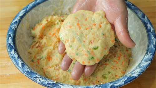 压好之后再加入胡萝卜丁、火腿丁、葱花、适量盐、生抽、十三香、适量的面粉,揉成面团,揉好后取一小块做成饼的形状