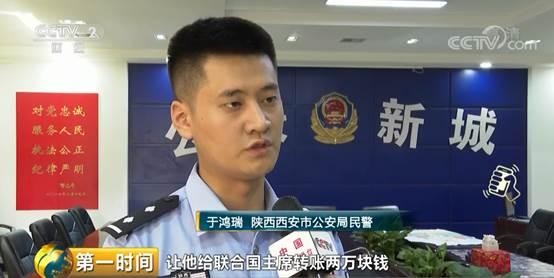 陕西西安市公安局民警 于鸿瑞:报警人朱某说他的妈妈邓某,让他给联合国主席转账两万块钱,并且可以把他介绍到联合国总部上班。