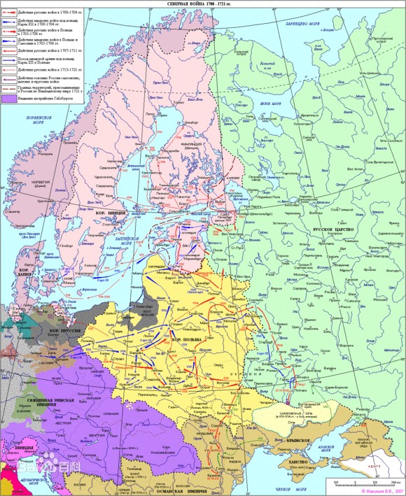 彼得大帝在改革增强了力量之后,重整旗鼓,先后在1708年列斯纳亚战役和1709年波尔塔瓦战役中打败瑞典好战国王卡尔十二世,尤其是波尔塔瓦一战,彼得亲临前线,给予瑞军以毁灭性打击。