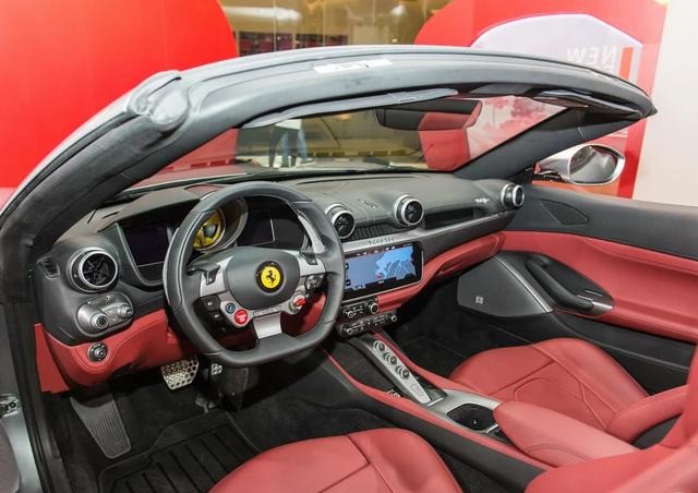 内饰方面,法拉利 Portofino的整体设计基本保持了California T的风格,但中控部分的变化比较明显。更大尺寸的大屏幕占据了中控的大部分面积,导致空调控制区缩水,不过看上去更加精致了。真皮包裹的方向盘依旧保留了平底设计。