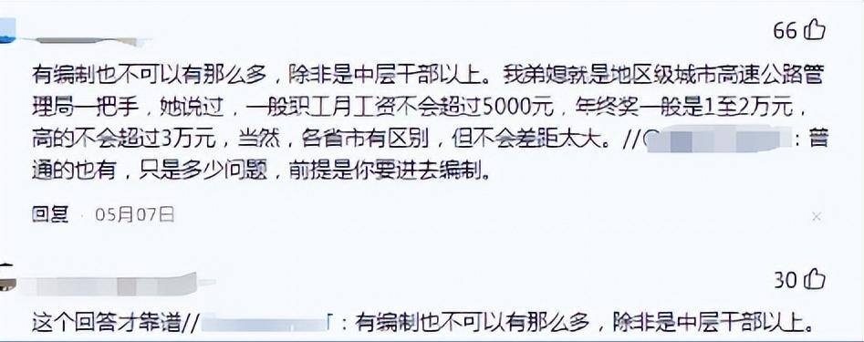 除非是中层干部以上编制。某地区级城市高速公路管理局一把手说过,一般职工月工资不会超过5000元,年终奖一般是1至2万元,高的不会超过3万元,当然,各省市有区别,但不会差距太大。