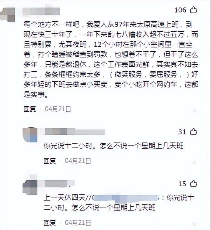 每个地方不一样,爱人在太原高速上班快三十年,尤其上夜班12个小时特别累,打瞌睡还被稽查罚款,这工作只表面看着光鲜,条条框框约束太多,说是微笑服务,其实是委屈服务。
