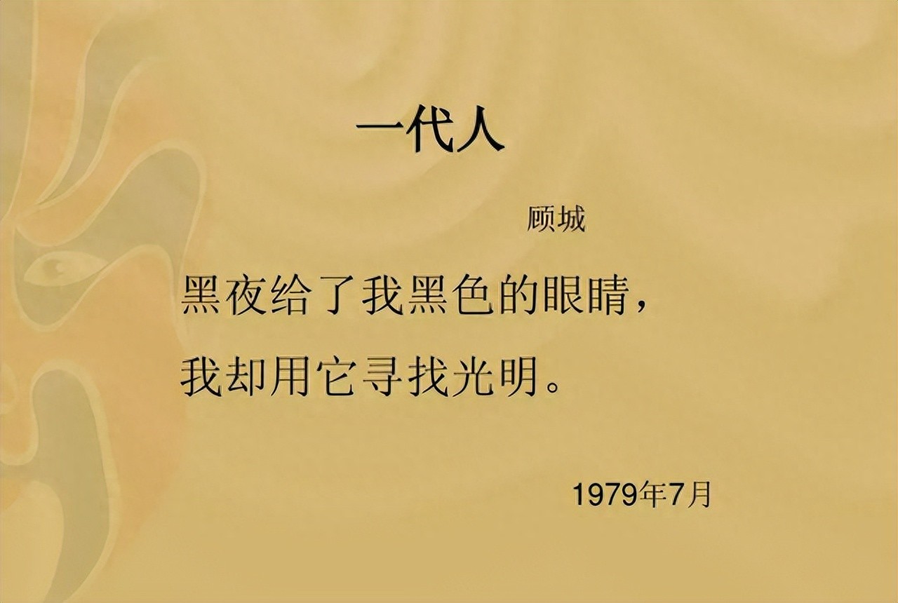 与唐宋时期相比,中国近现代的诗歌要匮乏得多。但是顾城的《一代人》,直到现在也仍被人记着。