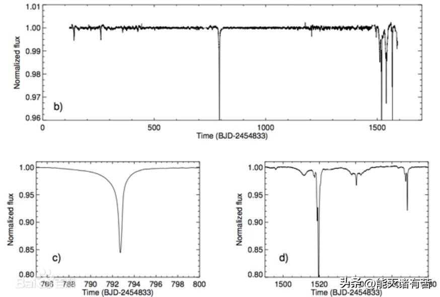 科学家在NASA的开普勒任务曾经观测过的十万多颗恒星中发现一颗名为KIC 8462852的恒星有着怪异的亮度变化:它的光变曲线上也有凹坑,但并非周期性出现。有些凹坑很深,有一个深达15%,还有一个甚至深达22%。