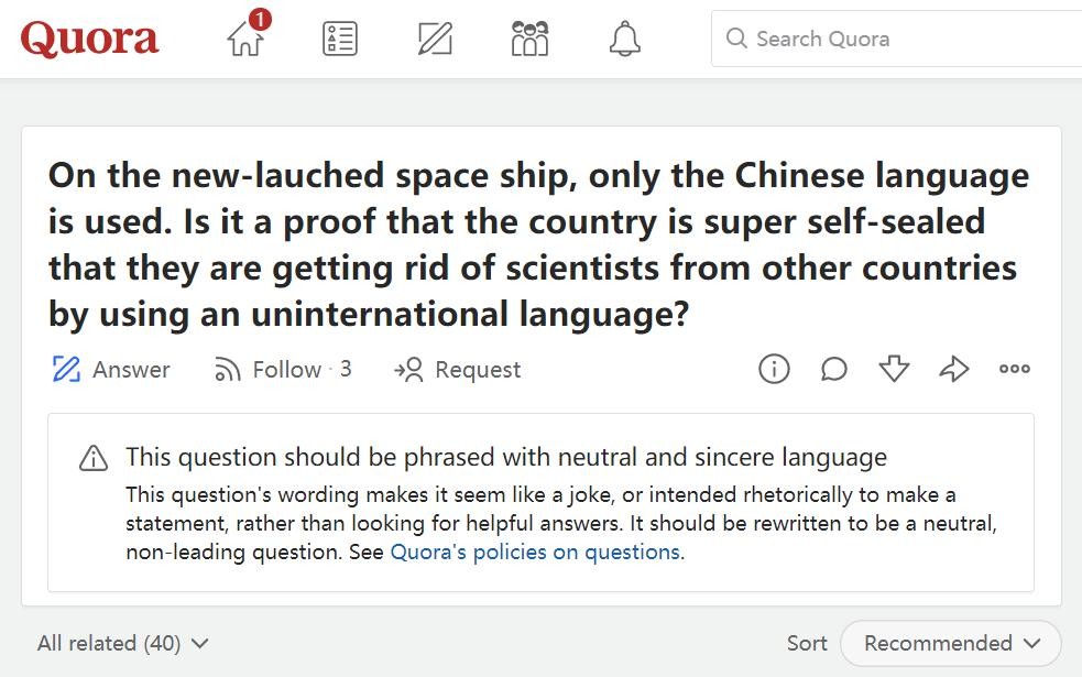 近日,中国“问天实验舱”与天和核心舱的成功对接,又再一次掀起了各界对中国航天事业发展的热议。这其中就有一名美国网友在美版知乎Quora上提问,为什么中国空间站的标识没有英文,只有中文?是不是因为这个国家超级自我封闭?便想要通过这种使用一种非通用语言的方式,摆脱来自其他国家的科学家?对于该网友的提问,评论区则是一边倒地选择支持中国,称其是典型的西方式傲慢。
